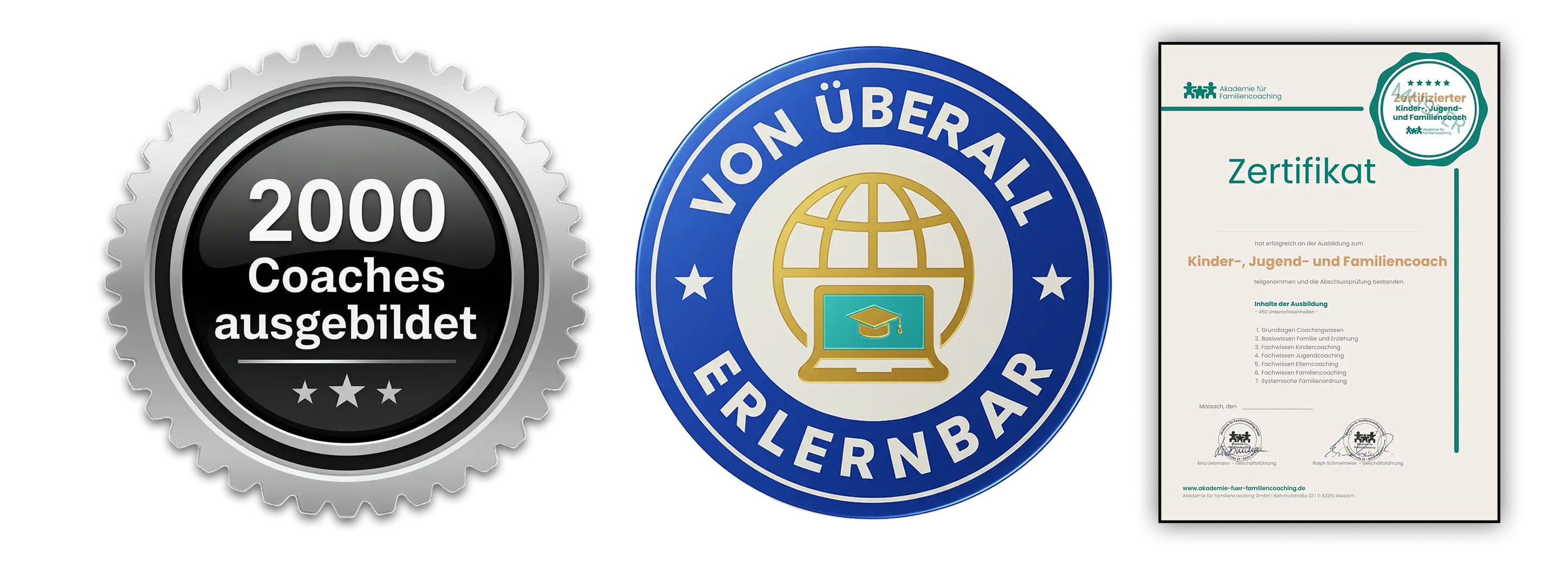 Nach erfolgreichem Abschluss der Ausbildung innerhalb von maximal 12 Monaten ab Kursbeginn erhältst du das Zertifikat ‚Zertifizierter Kinder-, Jugend- und Familiencoach der Akademie für Familiencoaching‘. Mit diesem Zertifikat darfst du offiziell das Siegel der Akademie für deine öffentliche Darstellung verwenden.